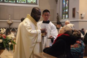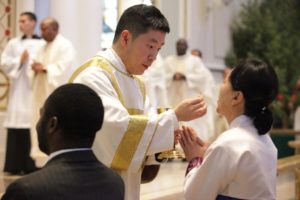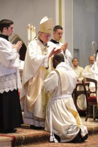 On Saturday December 8, the Solemnity of the Immaculate Conception, we celebrated an ordination in which two men were ordained: one to the diaconate and one to the priesthood. This is indeed a cause for great joy for the Church of Vancouver and for the Cathedral! Guy Zidago, originally from Ivory Coast was ordained a priest, and Felix Min from South Korea was ordained a deacon.