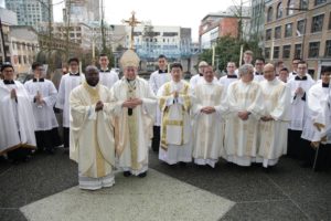 On Saturday December 8, the Solemnity of the Immaculate Conception, we celebrated an ordination in which two men were ordained: one to the diaconate and one to the priesthood. This is indeed a cause for great joy for the Church of Vancouver and for the Cathedral! Guy Zidago, originally from Ivory Coast was ordained a priest, and Felix Min from South Korea was ordained a deacon.