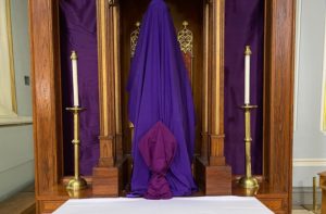 It is common to see that during Holy Week the images in the churches are covered with a purple veilings. Purple or violet is the penitential colour of the Church’s