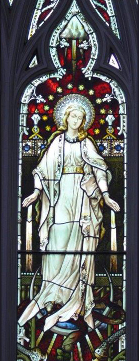 The commisioning of this window which had been earmarked ten years earlier, was finally confirmed in 1951. It was completed and shipped out of the Nincheri studios in November 1953 and installed later that year. With its bright colours and interesting composition, the window is a fitting memorial of the Assumption of the Blessed Virgin Mary, body and soul into heaven at the end of her earthly life. We are reminded of our faith in the resurrection of the body and of life everlasting: she is model, exemplar, and hope for the Church. View window.